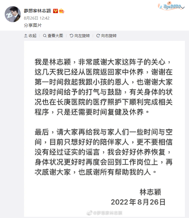 8月26日,林志颖车祸后首度在社交网站上发文报平安