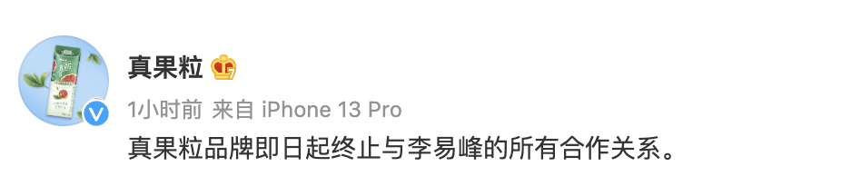 9月11日晚,认证为内蒙古蒙牛乳业(集团)股份有限公司的@真果粒 发声明称,即日起终止和李易峰所有合作关系。
