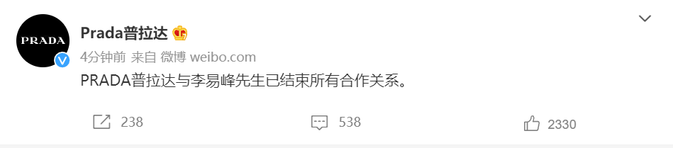 普拉达微博宣布,PRADA普拉达与李易峰先生已结束所有合作关系。