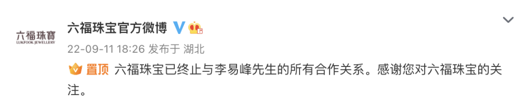 六福珠宝官微博表示,已终止与李易峰先生的所有合作关系。