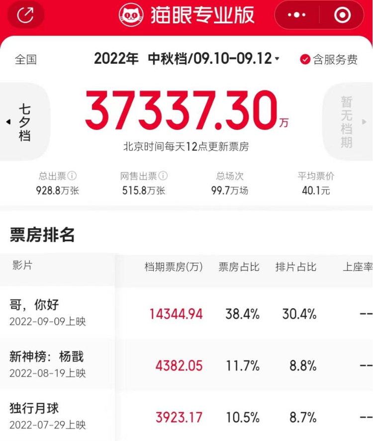 据灯塔专业版数据显示,截至9月12日24时,2022中秋档电影(9月10日-9月12日)总票房3.73亿(含预售),票房前三名影片分别为:《哥,你好》1.43亿,《新神榜:杨戬》4382万,《独行月球》3923万。
