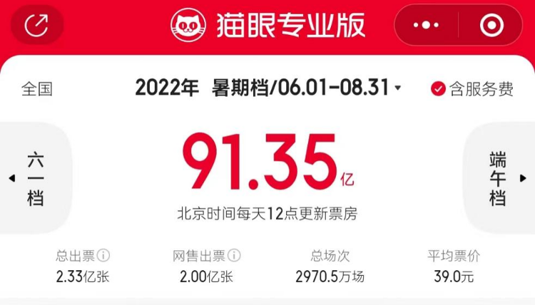 猫眼专业版数据显示,2022年中秋档电影票房收入为3.73亿元,而过去五年中秋档的票房收入分别为4.99亿元、7.44亿元、8.03亿元、5.31亿元、3.55亿元,这意味着今年中秋档创下了2017年以后的新低。