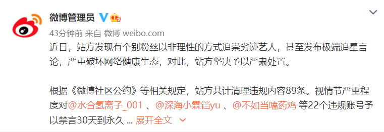 近日,微博站方发现有个别粉丝以非理性的方式追崇劣迹艺人,甚至发布极端追星言论,严重破坏网络健康生态,对此,站方坚决予以严肃处置。