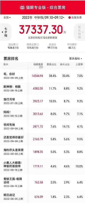 根据猫眼专业版数据,9月10日至12日,中秋档总票房达3.7亿元,档期总场次99.7万,观影总人次928.8万。温情喜剧《哥,你好》以1.4亿元的档期票房,领跑中秋档。