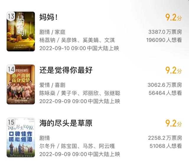 从猫眼评分来看,《妈妈!》《还是觉得你最好》《海的尽头是草原》则在新片中口碑最高,三片均得分9.2分。