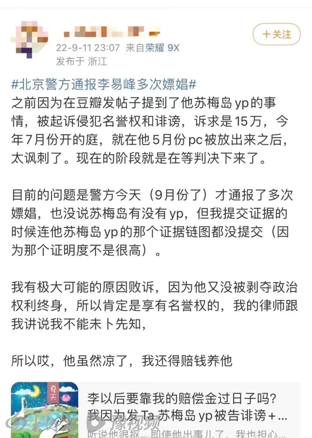 大学生豆瓣发文称“李易峰渣男”“yp”被起诉