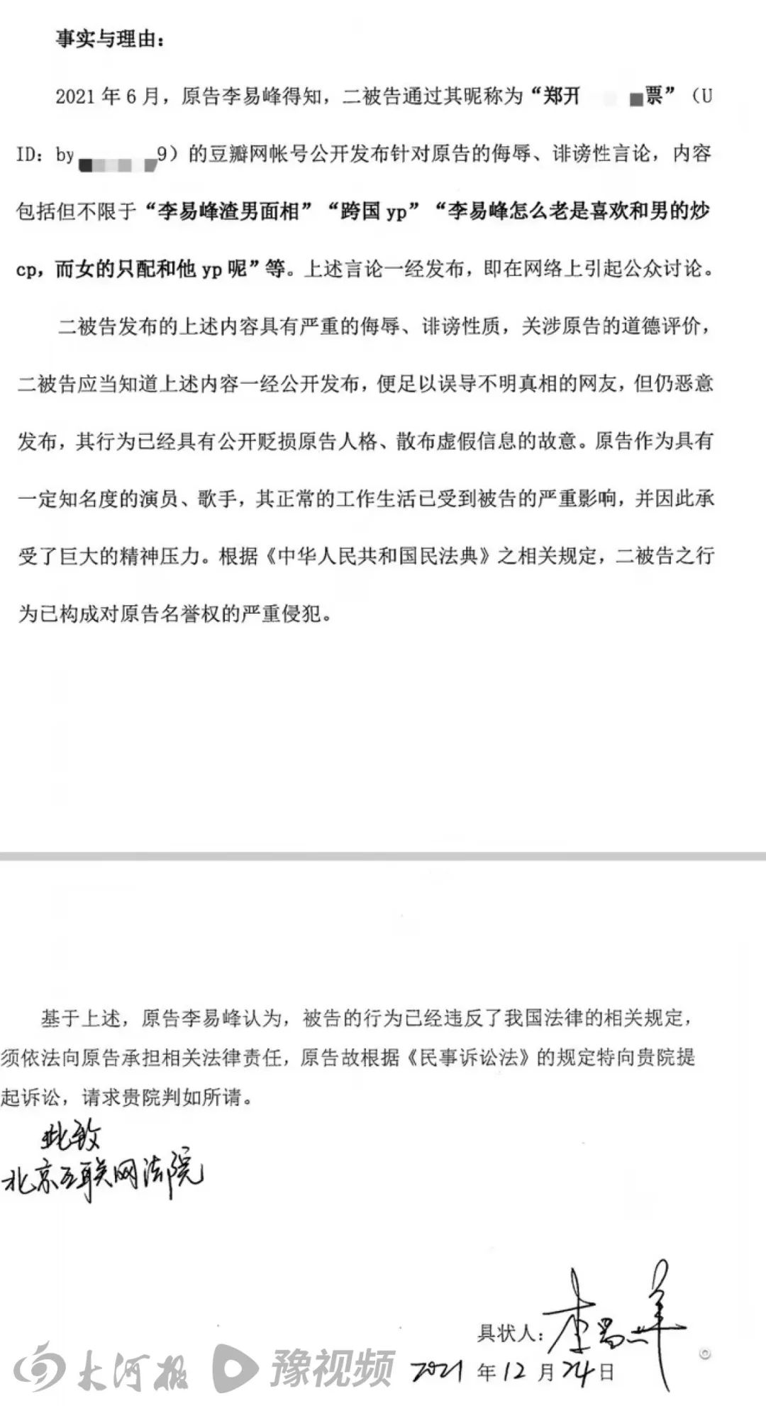 大河报·豫视频记者注意到,这并非是李易峰首次起诉网友散播谣言。