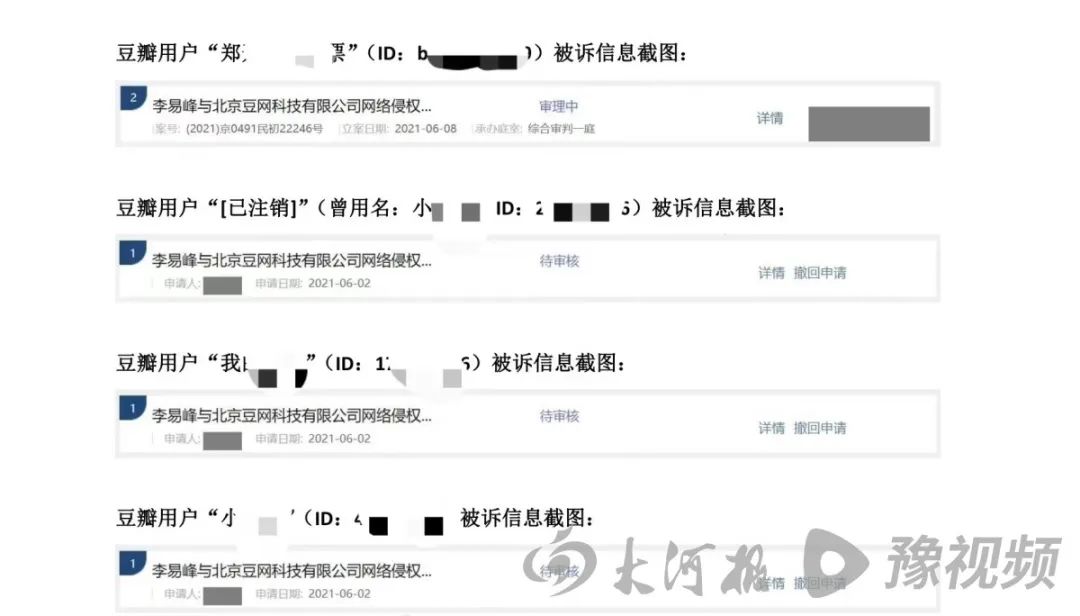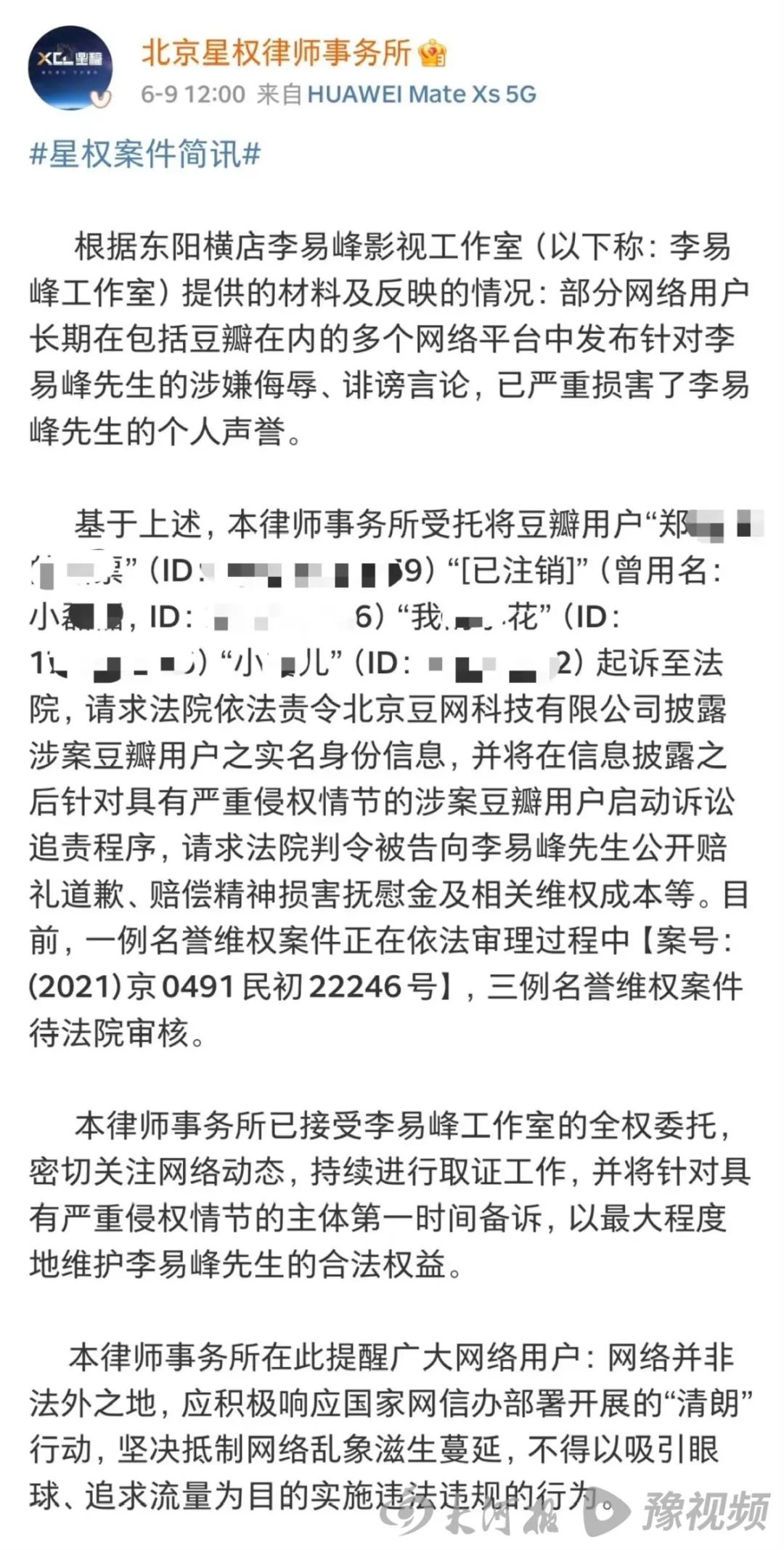 大河报·豫视频记者注意到,北京星权律师事务所2021年6月9日曾在自己官微上发文称,受李易峰委托处理4名豆瓣用户名誉维权案件。2022年9月14日,记者已搜索不到该条微博内容。
