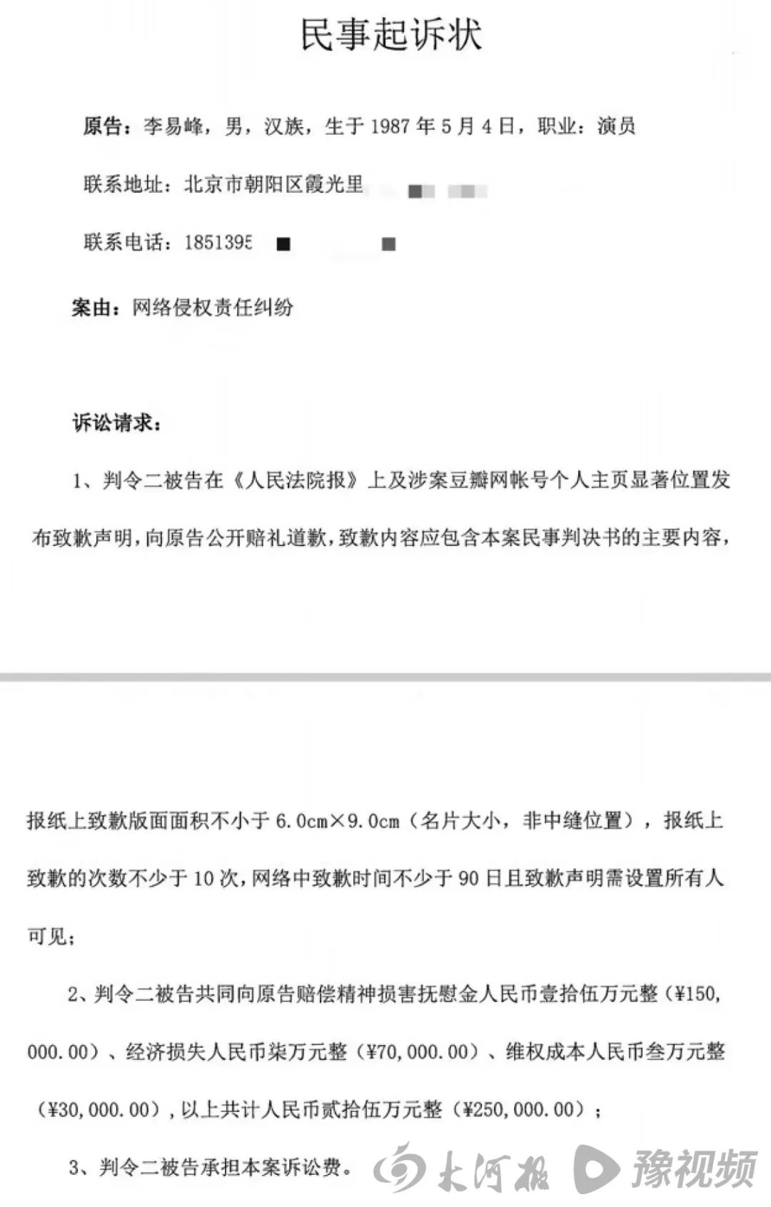 晓惠向记者提供了一份原告方的《民事起诉书》,该起诉书的诉讼请求是“判令被告(晓惠)在《人民法院报》上及涉案豆瓣网账号个人主页显著位置发布致歉声明,向原告(李易峰)公开赔礼道歉,并要求被告向原告赔偿精神损害抚慰金、经济损失、维权成本,共计25万元。