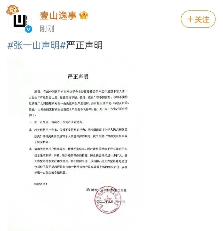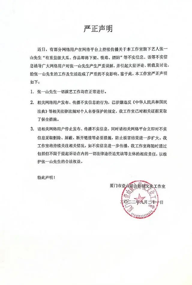 21日20:06,张一山工作室官方账号“壹山逸事”发布严正声明称,网络平台上有关张一山“作品即将下架、吸毒、嫖娼”等传言均为不实信息,属恶意诱导广大网络用户对张一山产生严重误解,已经对张一山的工作和生活产生严重不良影响。