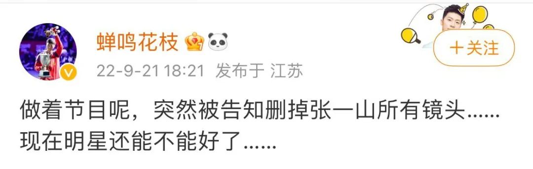 9月21日18:21,微博认证为体育博主的“蝉鸣花枝”突然发布微博称,“做着节目呢,忽然被告知删掉张一山所有镜头……现在明星还能不能好了……”