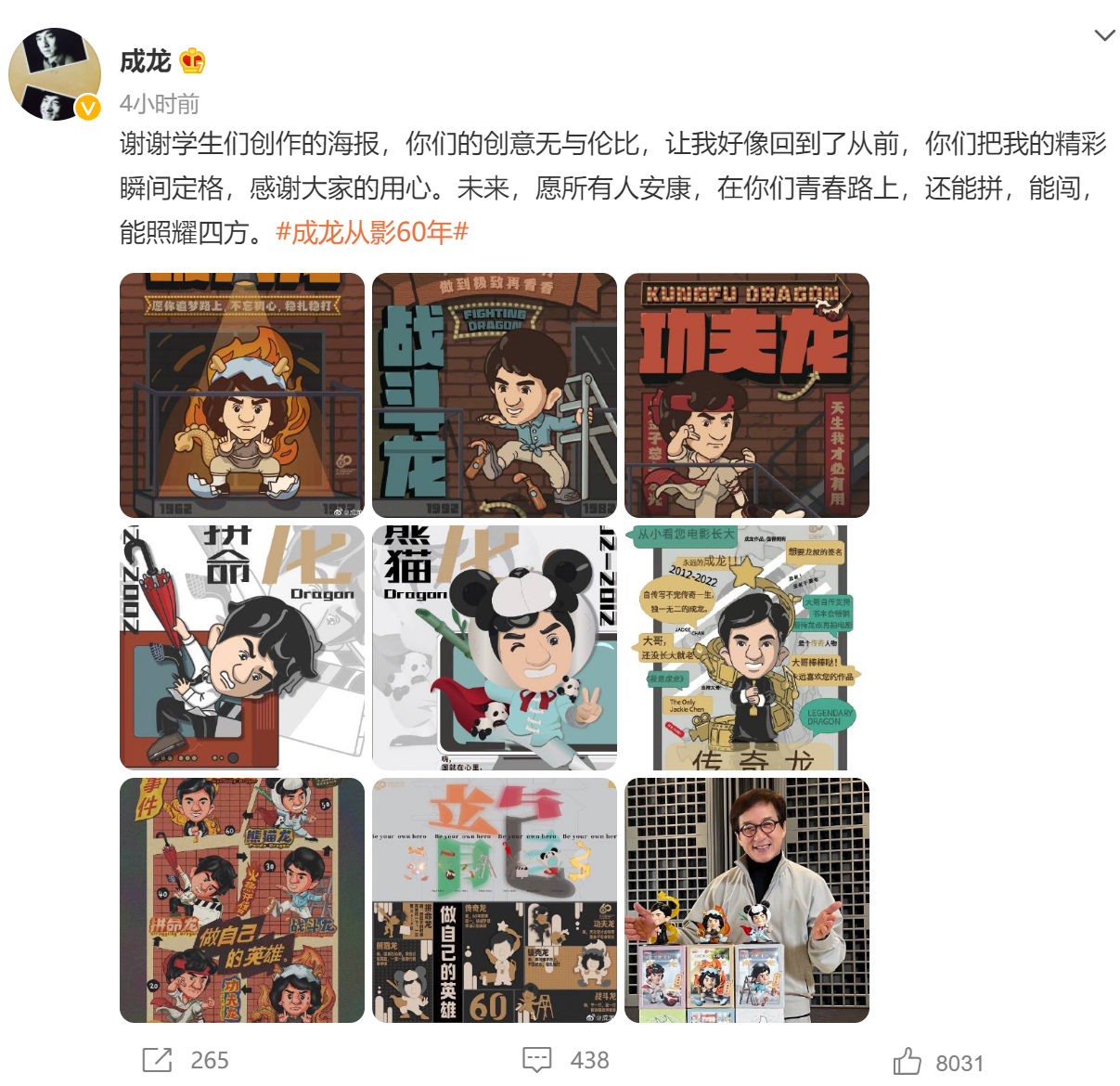 10月26日,演员成龙在个人社交平台账号上晒出学生们为其创作的海报,并配文称,“谢谢学生们创作的海报,你们的创意无与伦比,让我好像回到了从前,你们把我的精彩瞬间定格,感谢大家的用心。未来,愿所有人安康,在你们青春路上,还能拼,能闯,能照耀四方。”