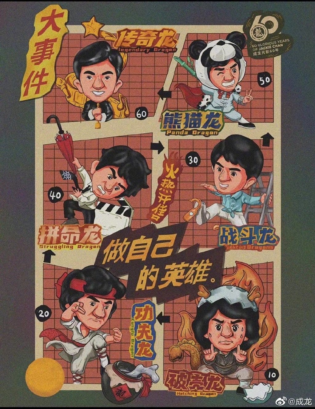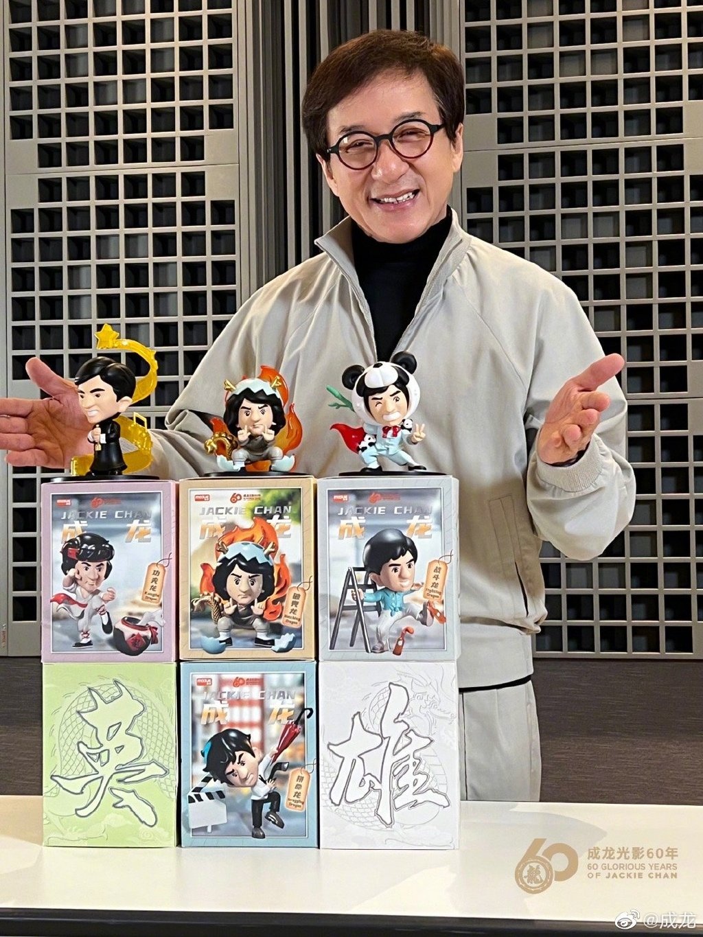 除此以外,成龙还晒出了纪念其从影60周年的萌态各趣的卡通手办。