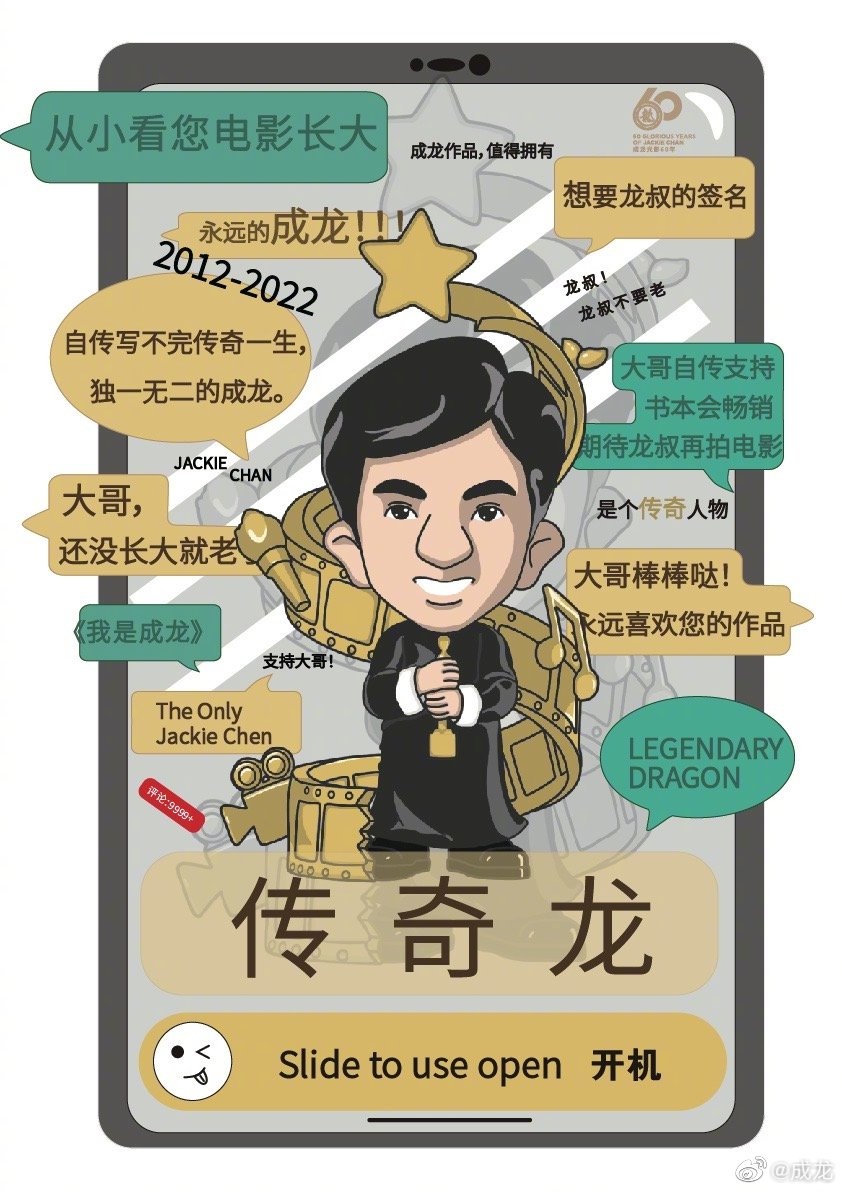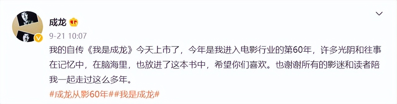 9月21日,成龙在个人社交平台账号上发文称,“我的自传《我是成龙》今天上市了,今年是我进入电影行业的第60年,许多光阴和往事在记忆中,在脑海里,也放进了这本书中。”