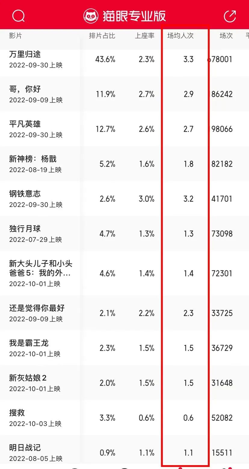 从影片的场均人次来看也是如此,除了头部影片勉强维持在3人左右,其他影片均在2左右徘徊,有的影片甚至不足1。