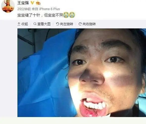 一次吊威亚,他意外受伤,嘴部缝了十针,马上带着伤回片场继续拍摄。