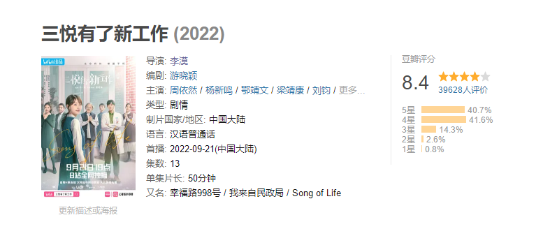 会员完结一周之后,《三悦有了新工作》豆瓣评分依然保持在8.4。