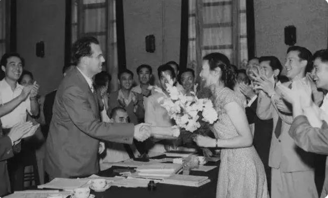 杜马舍夫指挥班结业时,郑小瑛作为唯一的女生,代表大家向老师献花