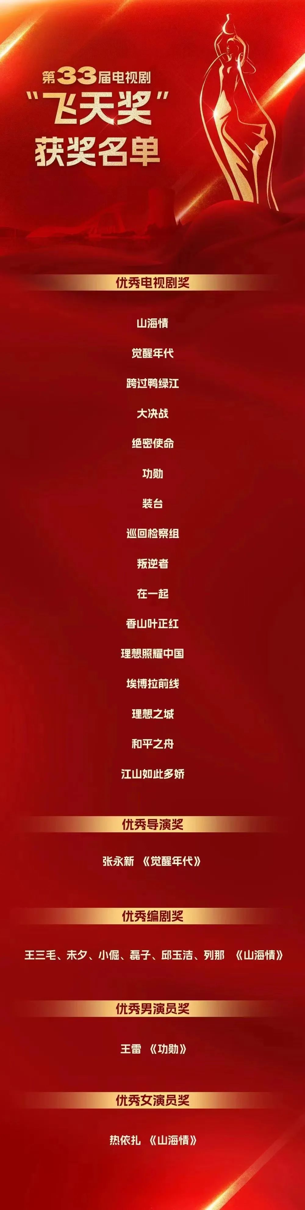 第33届电视剧“飞天奖”入围作品46部,评出优秀电视剧奖获奖作品16部,以及优秀导演奖、优秀编剧奖、优秀男演员奖、优秀女演员奖4个单项奖:《山海情》《觉醒年代》《跨过鸭绿江》《大决战》《绝密使命》《功勋》《装台》《巡回检查组》《叛逆者》《在一起》《香山叶正红》《理想照耀中国》《埃博拉前线》《理想之城》《和平之舟》《江山如此多娇》获优秀电视剧奖;张永新凭借电视剧《觉醒年代》获优秀导演奖;王三毛、未夕、小倔、磊子、邱玉洁、列那等凭借电视剧《山海情》获优秀编剧奖;王雷凭借《功勋》获优秀男演员奖;热依扎凭借电视剧《山海情》获优秀女演员奖。