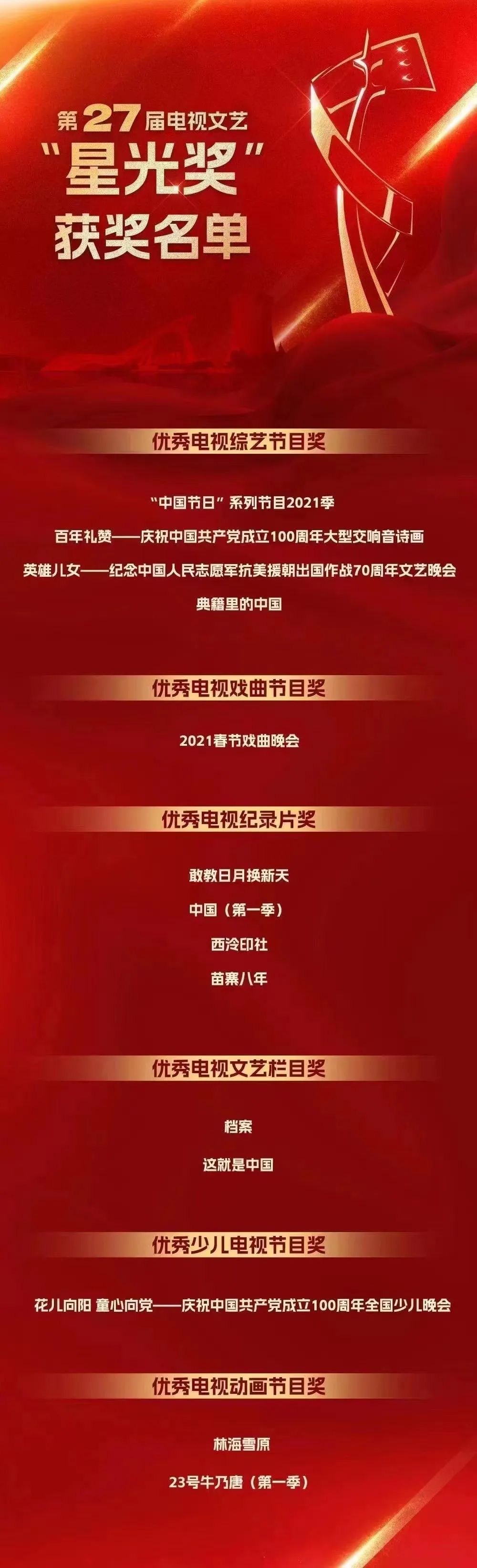 第27届电视文艺星光奖入围作品69部,评出优秀电视节目奖获奖作品14部:《“中国节日”系列节目2021季》《百年礼赞——庆祝中国共产党成立100周年大型交响音诗画》《英雄儿女——纪念中国人民支援军抗美援朝出国作战70周年文艺晚会》《典籍里的中国》获优秀电视综艺节目奖;《2021春节戏曲晚会》获优秀电视戏曲节目奖;《敢教日月换新天》《中国(第一季)》《西泠印社》《苗寨八年》获优秀电视纪录片奖;《档案》《这就是中国》获优秀电视文艺栏目奖;《花儿向阳 童心向党——庆祝中国共产党成立100周年全国少儿晚会》获优秀少儿电视节目奖;《林海雪原》《23号牛乃唐(第一季)》获优秀电视动画节目奖。