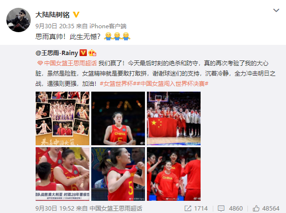 最后一条微博则停留在了9月30日,为中国女篮加油打气。