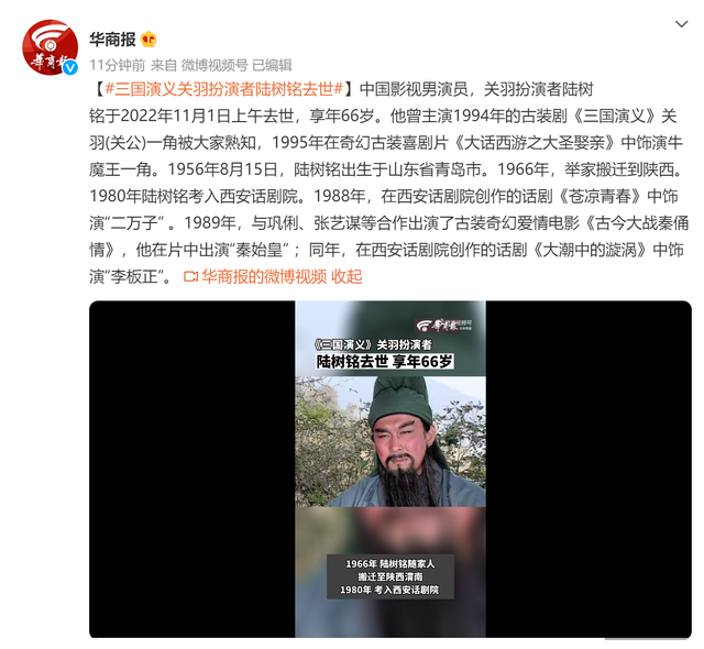 据红星新闻,中国影视男演员,关羽扮演者陆树铭于2022年11月1日上午去世,享年66岁。友人透露,陆树铭因心梗突然去世。