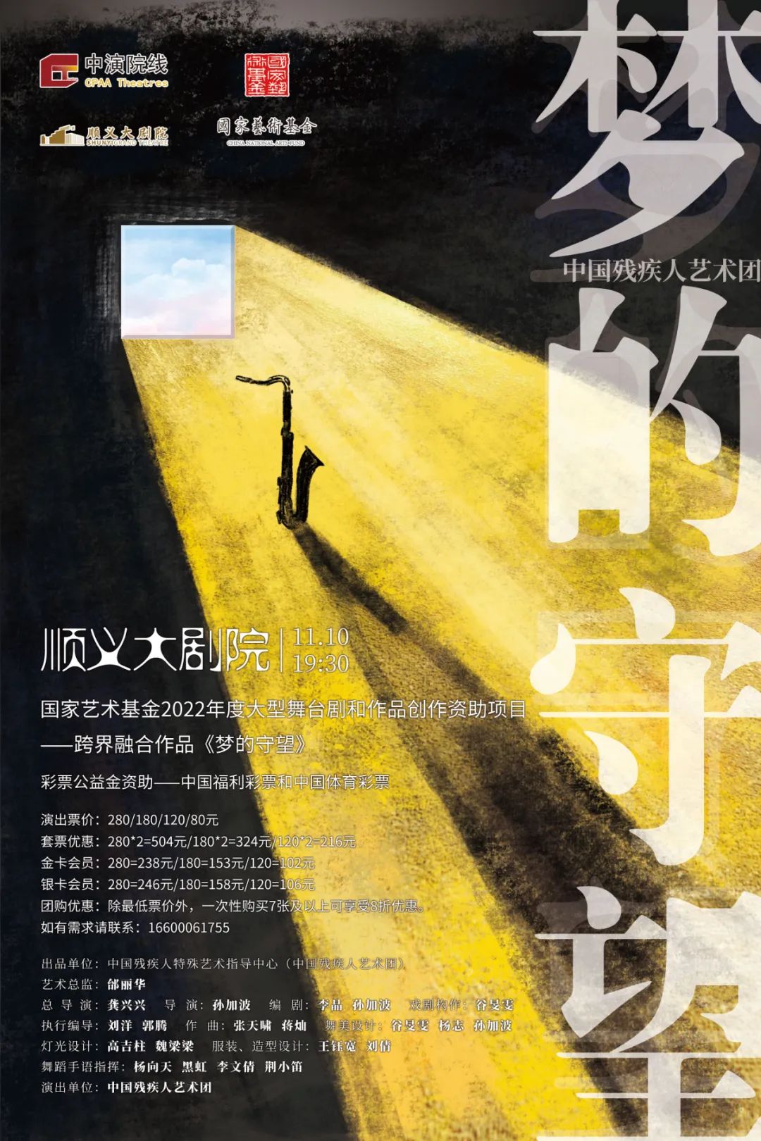 国家艺术基金2022年度大型舞台剧和作品创作资助项目——跨界融合作品《梦的守望》是一台以中国残疾人艺术团的盲人萨克斯演员王琦的亲身经历为蓝本,与多名身有障碍的演员的心路故事相融合,改编而成的舞台演出。