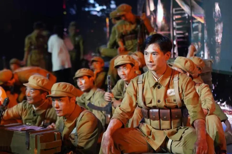 黄豆豆(右一)在情景合唱与舞蹈《战旗美如画》中扮演的志愿军战士形象