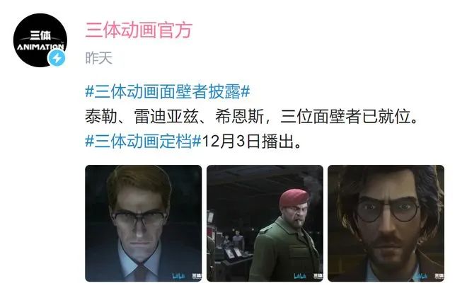从整体来看,《三体》动画没有选择从特效需求较少、更适合真人影视改编的原著第一部切入,而是将重心放在了剧情最精彩、故事线最繁杂、人物斗争最激烈的《三体2》的故事上,尤其注重对原著中脑洞大开的“面壁计划”的描绘。此前,官方就公布了三位重要角色罗辑、史强和丁仪的“定妆照”,以及与罗辑一起入选面壁计划的另外三位面壁者泰勒、雷迪亚兹和希恩斯的角色图。