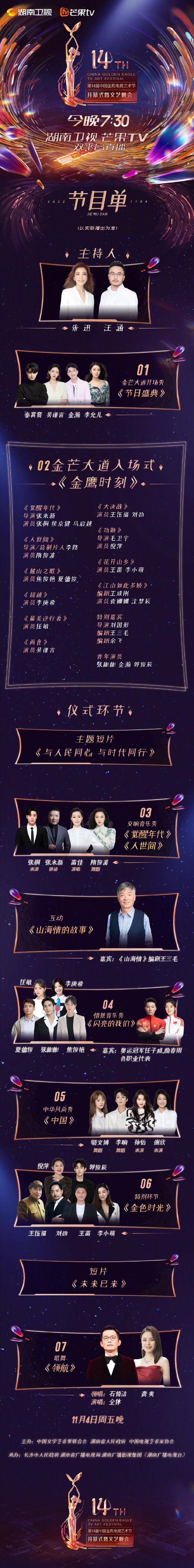 湖南卫视今天下午公布了第14届中国金鹰电视艺术节开幕式暨文艺晚会节目单:
