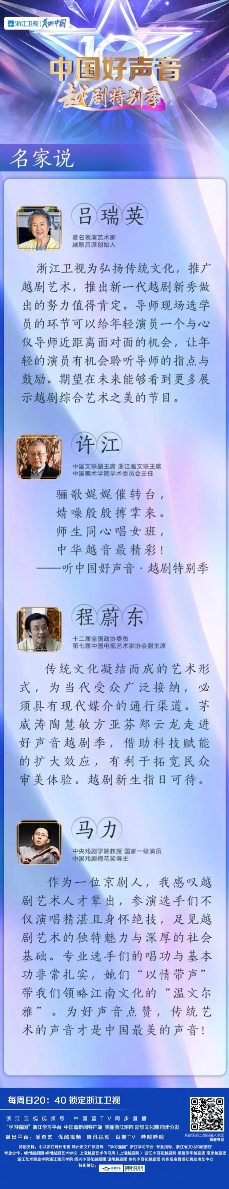 有传承就有创新,“越剧特别季”的舞台上不仅有“老调”,还有“新歌”。金派花旦徐虹演唱了一段“越歌”,曲调通俗,越韵十足,令人耳目一新。而几位男小生的亮相更是展现了越剧艺术的刚柔并济,让很多观众对越剧的“男女合演”有了更多的认识,纷纷表示“期待未来的越剧创作”。十二届全国政协委员,第七届中国电视艺术家协会副主席程蔚东在观看完节目后称赞表示,“传统文化凝结而成的艺术形式,为当代受众广泛接纳,必须具有现代媒介的通行渠道。茅威涛陶慧敏方亚芬郑云龙走进好声音越剧季,借助科技赋能的扩大效应,有利于拓宽民众审美体验。越剧新生指日可待。”