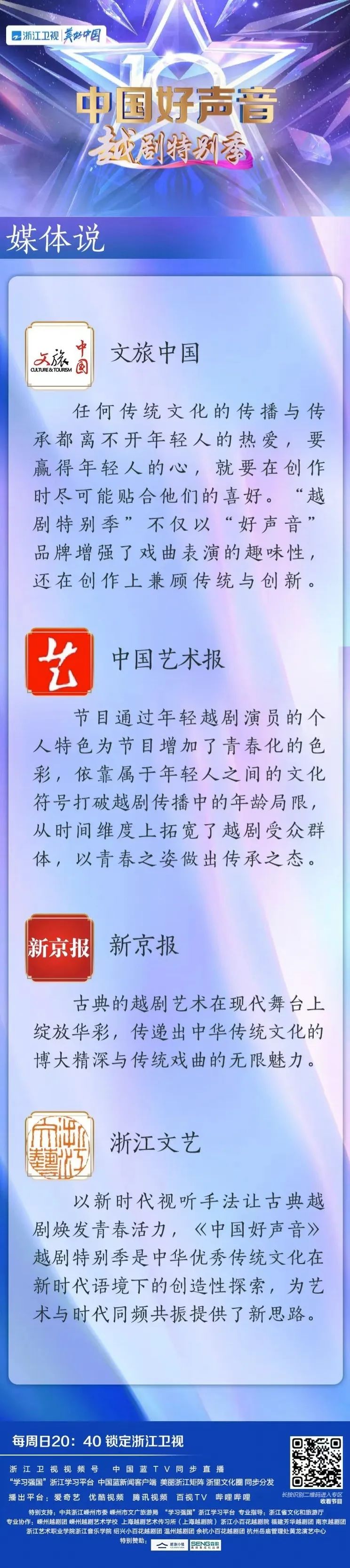 百年越剧在“好声音”的现代舞台上焕发光彩,让越剧艺术实现“破圈”传播。节目播出后,各界文化学者高度认可,我国著名表演艺术家、越剧吕派创始人吕瑞英表示,“浙江卫视为弘扬传统文化,推广越剧艺术,推出新一代越剧新秀做出的努力值得肯定。”中国文联副主席、浙江省文联主席、中国美术学院学术委员会主任许江点赞节目“骊歌娓娓催转台,婧噪殷殷搏掌来。师生同心唱女班,中华越音最精彩”。主流媒体好评如潮,文旅中国、中国艺术报、新京报、浙江文艺等发文肯定节目“以新时代视听手法让古典越剧焕发青春活力”。网友们纷纷留言道,“越剧迷太开心了,感觉像直接受到了大师们的指点”,“已入坑,才发现越剧这么好看”,“透过节目又对中国戏曲有了更深的了解,节目好看,导师专业,演员优秀,值得二刷”。