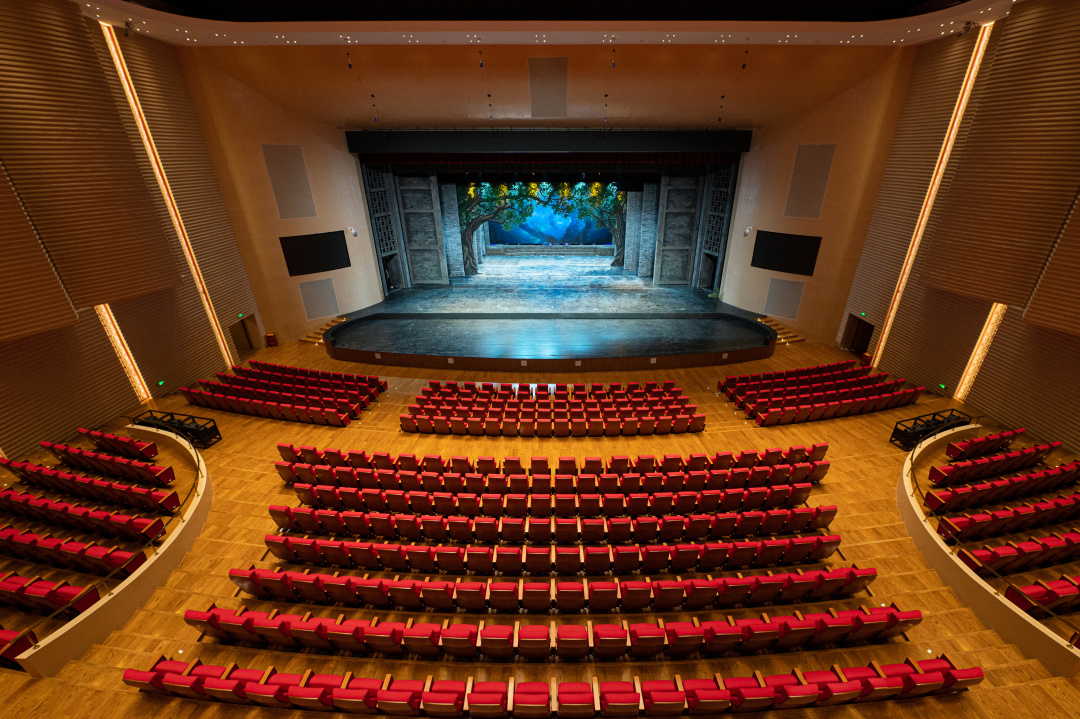 落下闳大剧院主要以春节文化为主题,以红色为主基调,包含了能够容纳1100余人的主场馆,每个座位都做了专业的视线分析,保证每一位观众都能完整欣赏到演出。剧院内有包含200余人的多功能厅、舞蹈排演室、器乐排练室、电影放映厅等众多现代化、科技化实用场馆。总建筑面积约26185平方米,其中地上19195平方米,地下6990平方米。整个剧院的墙面均采用特殊防火处理过的吸音材料装配而成,音响采用的是全息声技术,就连座椅上的红色靠垫也全部采用吸音材料,更奇妙的是,在观众厅顶部,通过在不同深度和角度安装精美的光纤束,打造出星光顶饰的独特效果,每颗“星星”的亮度都可以独立调节,从而塑造出一个宁静而深邃的表演氛围,让观众在观演时更能身临其境。
