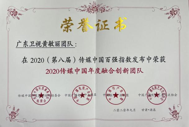 团队荣获2020(第八届)传媒中国百强指数发布——“2020传媒中国年度融合创新团队”