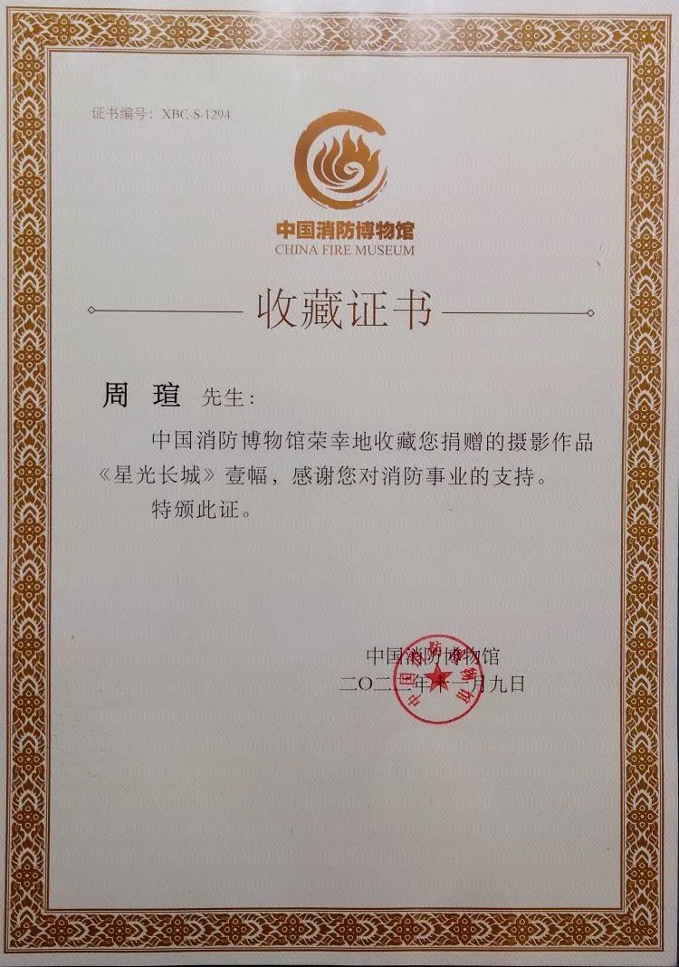 在节目现场,中国消防博物馆也向周瑄颁发收藏证书,对其拍摄的《星光长城》作品进行收藏,以展现在面对危难关头和紧急时刻时,无数中国人民逆行而上、齐心协力、众志成城的团结精神。
