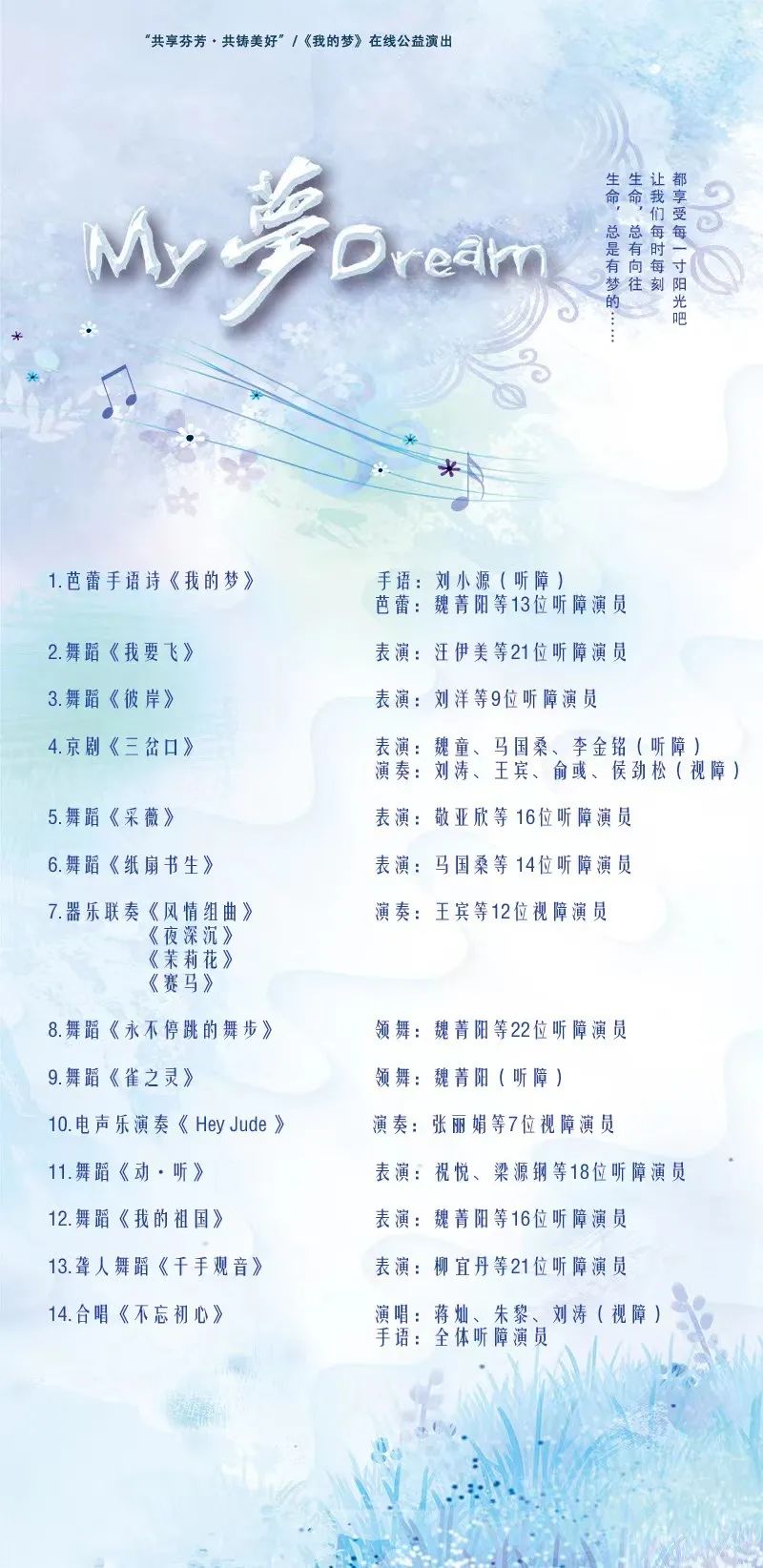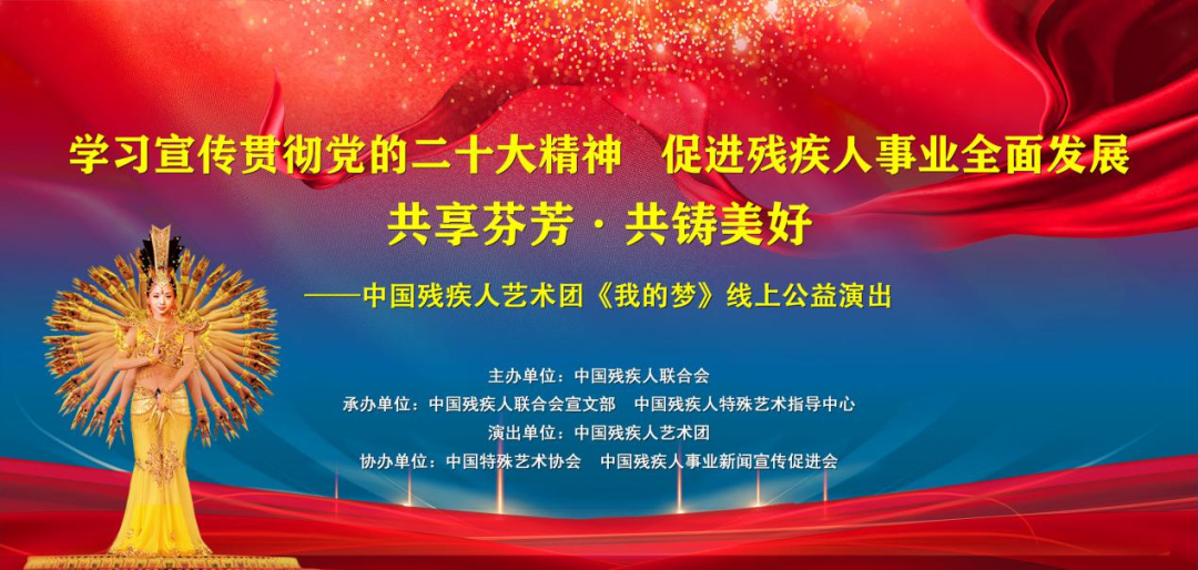 为学习宣传贯彻党的二十大精神,促进残疾人事业全面发展,丰富残疾人精神文化生活,由中国残疾人联合会主办,中国残联宣文部、中国残疾人特殊艺术指导中心承办,中国特殊艺术协会、中国残疾人事业新闻宣传促进会协办的“共享芬芳·共铸美好”中国残疾人艺术团《我的梦》线上公益演出将于12月8日至11日在中国网直播8场。敬请收看!