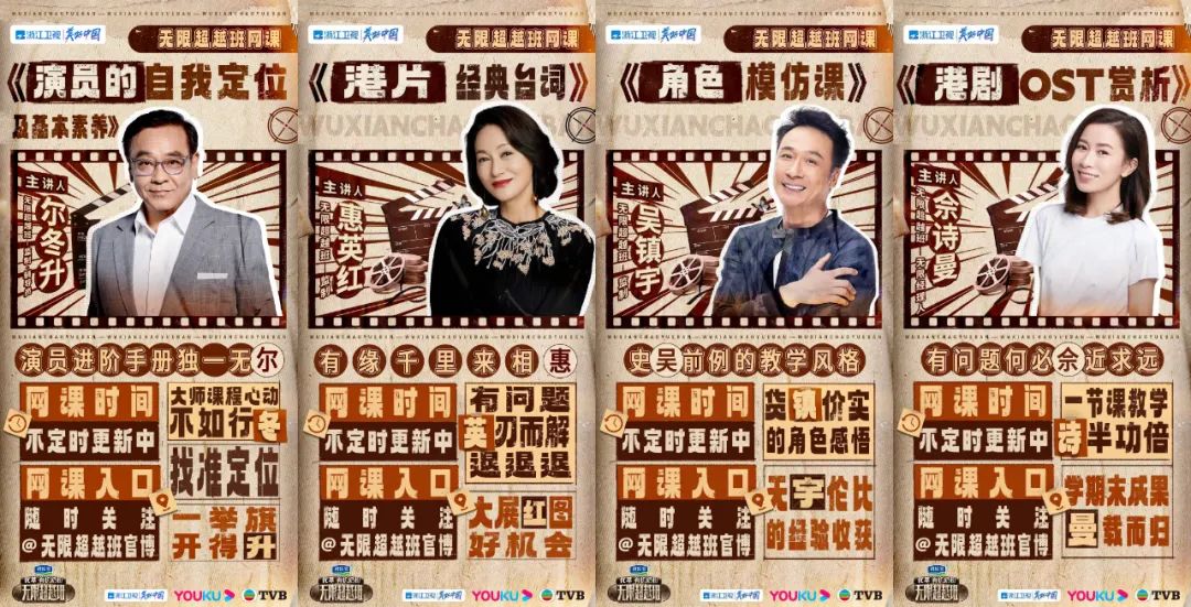 今日,由浙江卫视、优酷、TVB共同出品的演员专业艺训励志真人秀君乐宝《无限超越班》全员以“选网课”的形式创意官宣,并发布复古情怀宣传片。尔冬升、惠英红、吴镇宇、佘诗曼四位前辈艺人分别公布独家网课,无限超越班全体新艺员自主选课,并发布手写课表与创意工牌。相关话题#无限超越班全员选网课官宣# #无限超越班手绘工牌官宣#登录微博、抖音热搜榜,引爆讨论。