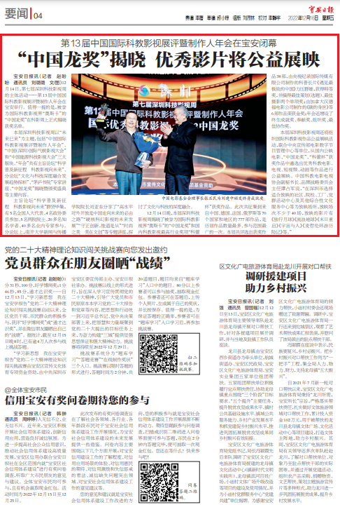 12月14日,第七届深圳科技影视周的主体活动——第13届中国国际科教影视展评暨制作人年会在宝安举行。值得一提的是,被誉为国际科教影视界“奥斯卡”的“中国龙奖”在科影周上正式揭晓获奖名单。