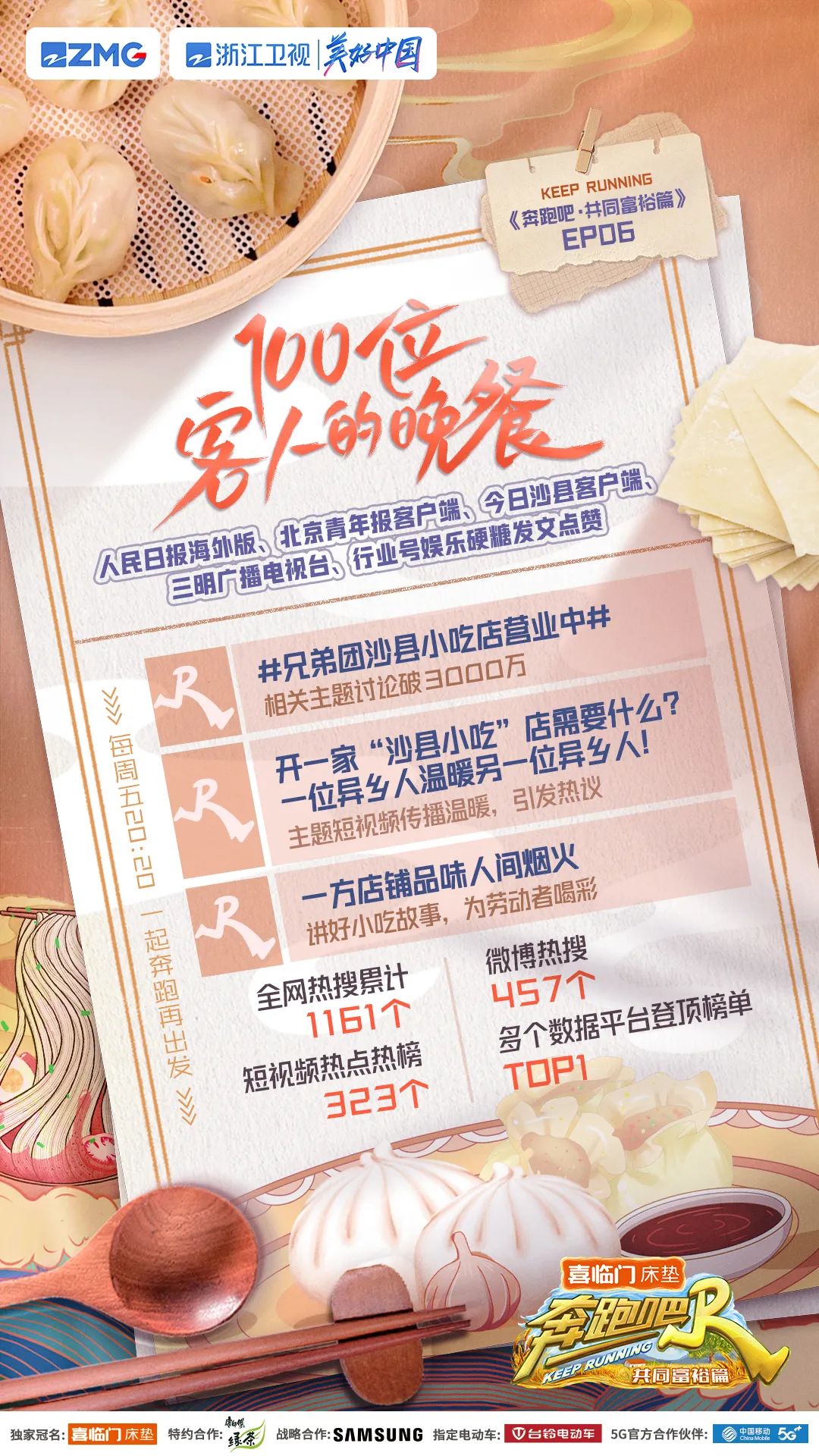 本期节目看见共富路上的最小单元、让劳动者汗水闪光的立意,收获人民日报海外版客户端、北京青年报客户端、今日沙县客户端等主流媒体点赞,并有行业大号娱乐硬糖发文,为节目通过小吃看见时代故事的精彩叙事点赞。节目全网累计斩获热搜1161个,其中微博热搜457个,短视频热点热榜323个,#兄弟团沙县小吃店营业中#相关主题讨论突破3000万。