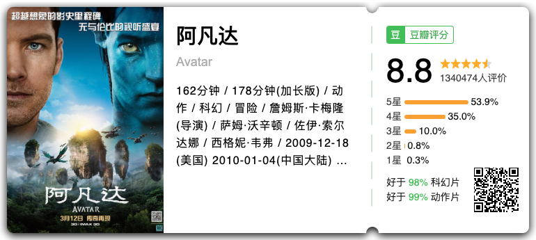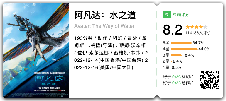 口碑方面,《阿凡达2》在两家票务平台分别拿下了9.2分,豆瓣则从开分的8.4分,掉到了8.2分。回看《阿凡达》,在豆瓣累积130万人评价,迄今评分高达8.8分。