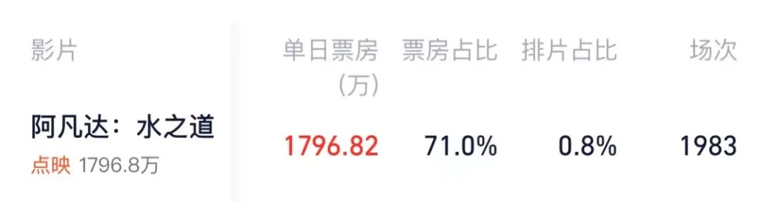 虽然上映前两天单日票房均超1亿,占比超95%,但周日直接下滑,并未过亿,最终结合点映场和零点场,《阿凡达2》中国内地首周票房不足4亿。