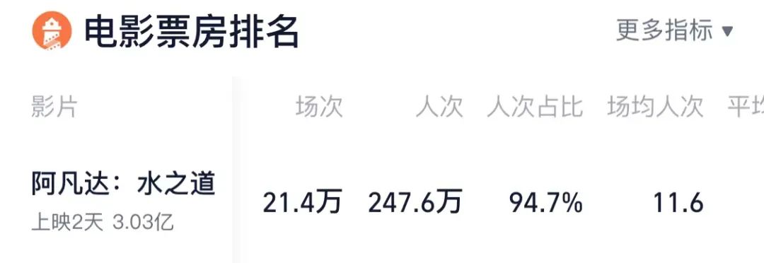 《阿凡达2》上映首日票房1.26亿,其中排片占比79.7%,场均人次10.6人,上座率为7.8%。这组数据看似不错,但是就一部重点影片而言,该场均人次似乎并没有体现真正的号召力。毕竟,场均人次是直接证明了观众对这部电影的观影欲望。