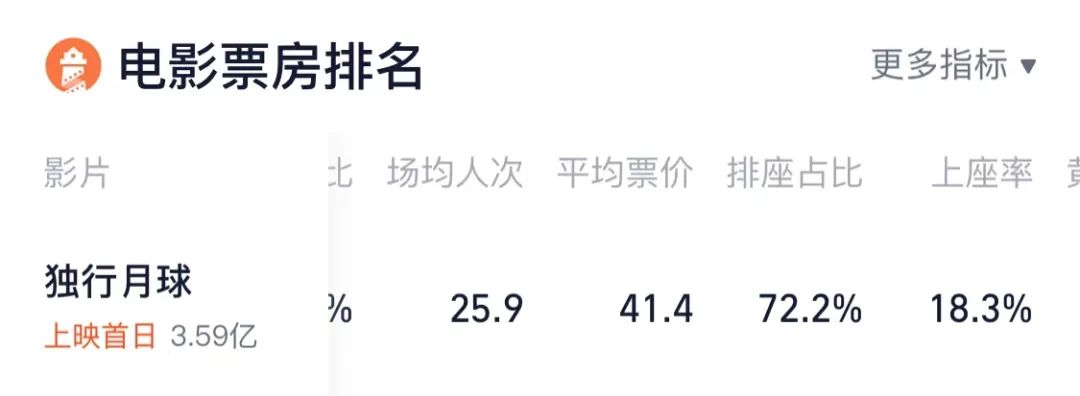今年另一部高票房影片《独行月球》,首日排片62.8%,场均人次为26人,上座率为18.3%。