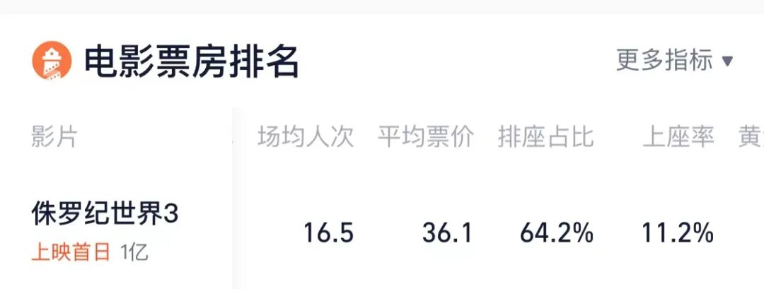 同样是今年好莱坞大片《侏罗纪世界3》,首日排片53.4%,场均人次16人,上座率11.2%。