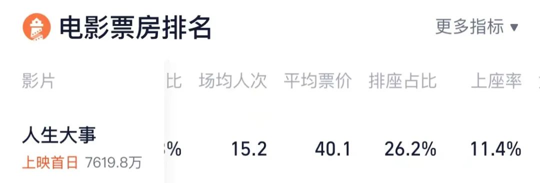 简单举几个例子,《人生大事》上映首日场均人次15人,上座率11.4%。当然,该片为18点上画,或是很难直接作为同比案例。