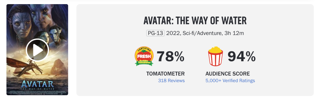 作为最先释出口碑的北美市场,《阿凡达2》在“烂番茄”网站中,媒体、影评人的新鲜度83%,均分7.3分。而观众方面,烂番茄爆米花指数达94%,影迷均分高达4.7星(满分5星)。