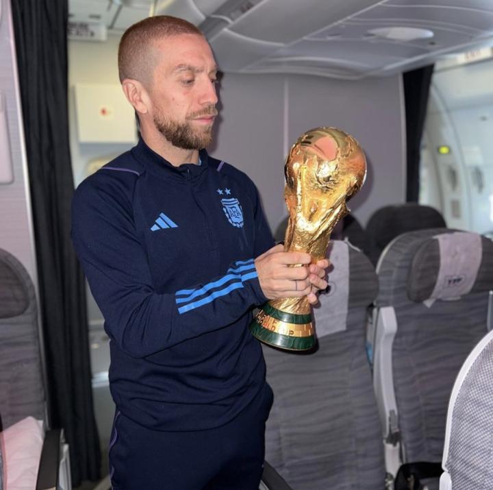 德保罗戴上了小蓝帽,他晒出了在飞机上亲吻大力神杯的照片。