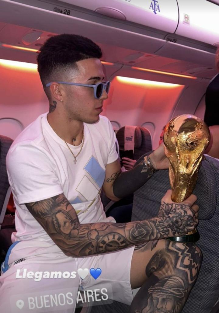 恩佐-费尔南德斯更新了社交媒体,晒出了带着大力神杯回到阿根廷的照片。