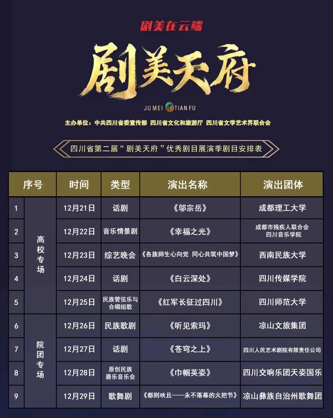 12月21日,由中共四川省委宣传部、四川省文化和旅游厅、四川省文学艺术界联合会主办的四川省第二届剧美天府优秀剧目展演季线上展播活动拉开帷幕,将为广大观众献上11场“云端”演艺盛宴,四川观察客户端将进行同步直播。