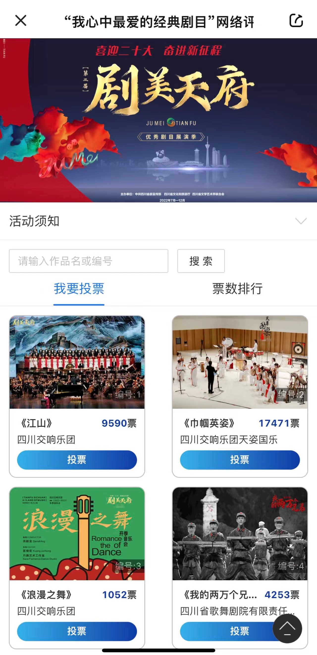 在观看好戏好剧的同时,也别忘了为四川优秀舞台剧目打call!四川省第二届“剧美天府”网络评选活动火热进行中,即日起至2022年12月31日,大家可登录《四川观察》APP,在首页点击圆形按钮即可进入投票通道,每位用户每天可投10票,你的支持将成为该剧目最终获得“最受观众喜爱的剧目、最佳剧目、优秀剧目等”荣誉的重要依据。赶紧来投票选出你心中的优秀舞台艺术作品吧。